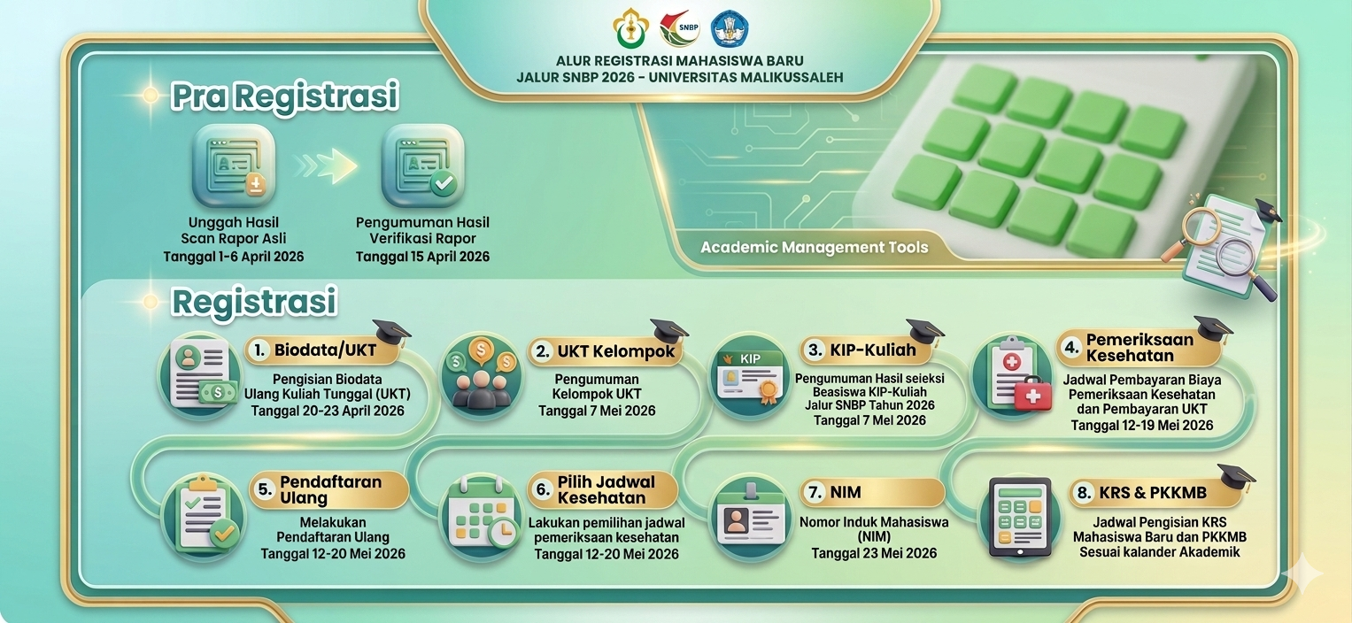Penerbitan Nomor Induk Mahasiswa / NIM (23 Mei 2026): Jika seluruh tahap di atas telah selesai dan diverifikasi, sistem akan menerbitkan NIM sebagai tanda identitas resmi mahasiswa Universitas Malikussaleh.